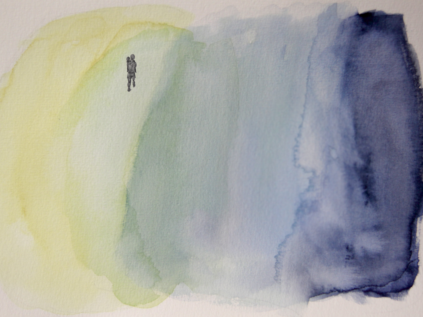 In an attempt to process his feelings, depicted as color areas and different stroke styles, we finally see him as an adult in loving contact with his own child.